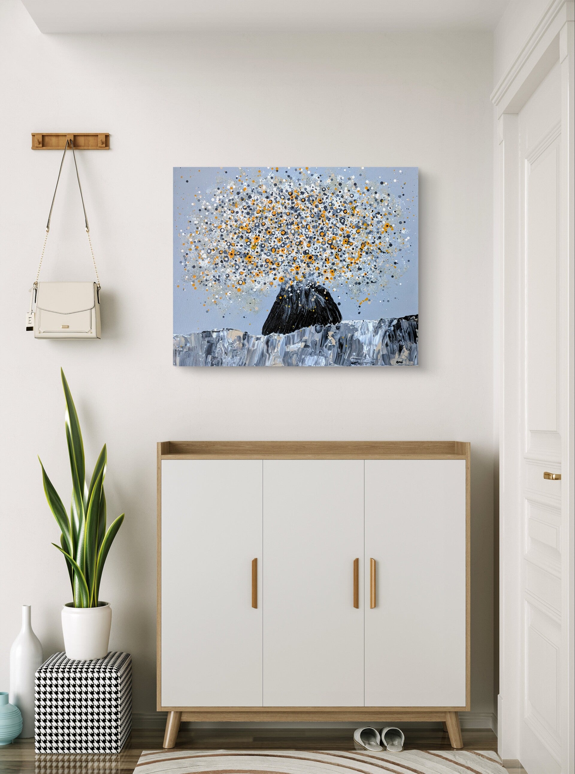 Bilde 50x61cm malt på bomullslerret med akrylmaling. Trenger derfor ikke ramme, og du kan montere bildet rett på veggen. Sprayet med varnish spray for beskyttelse.
